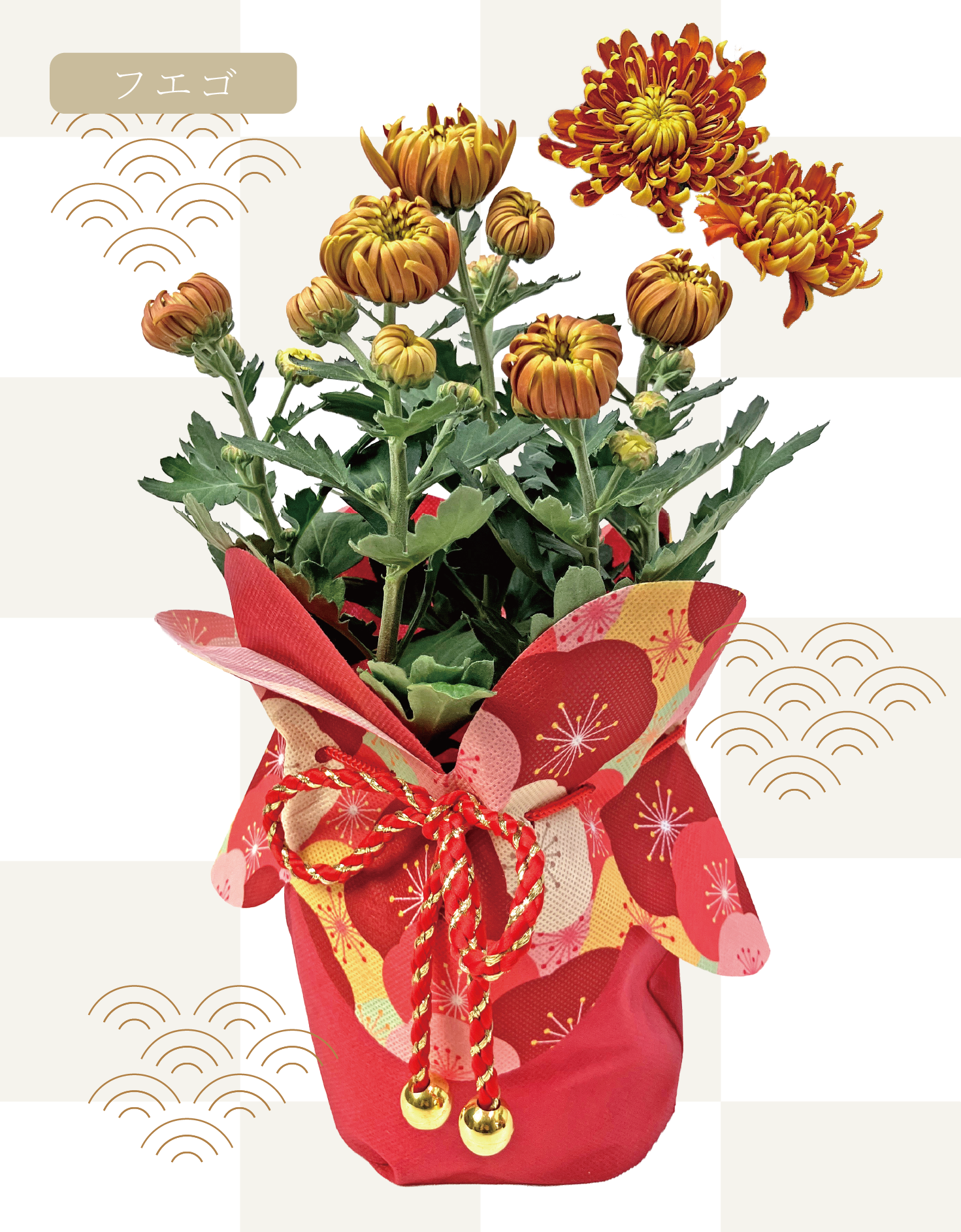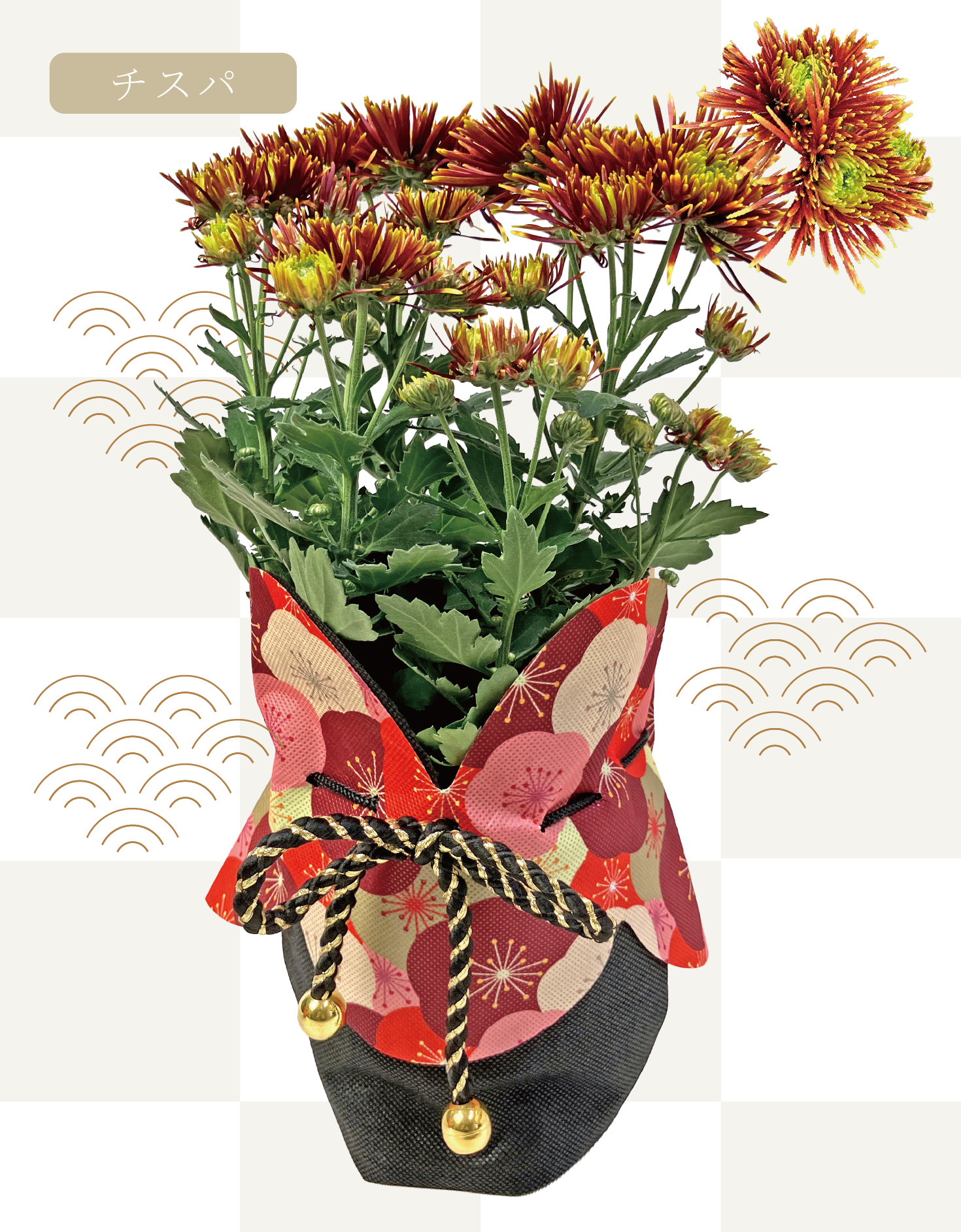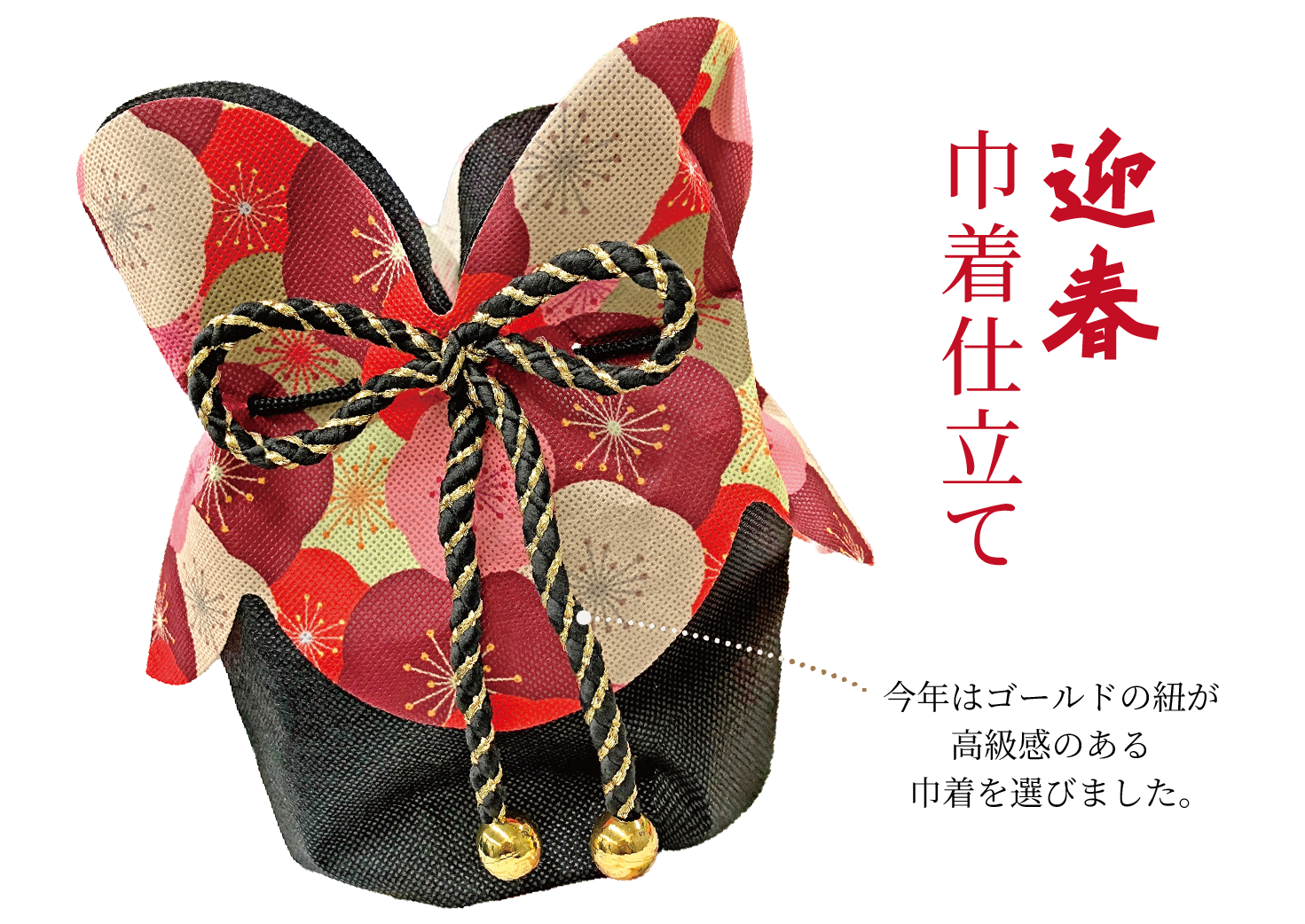 昨年もご好評いただいた、豪華な花が特徴の切り花系品種を使った迎春巾着仕立て。