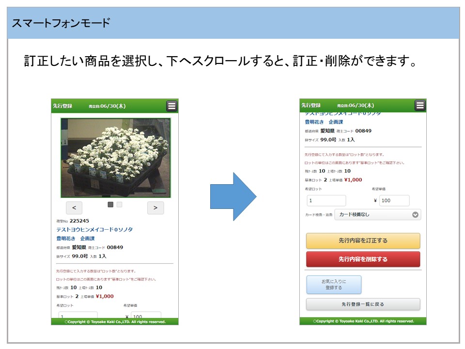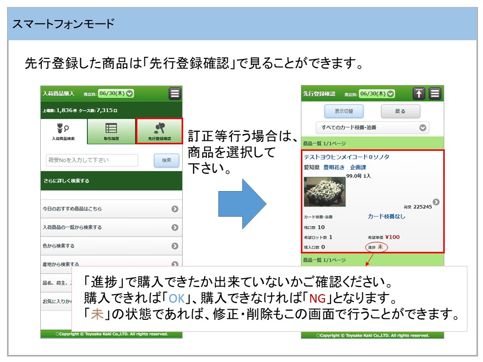 先行登録した商品は、入荷商品購入「先行登録確認」でご確認いただけます。 訂正・削除を行う場合は、該当商品をタップしてください。