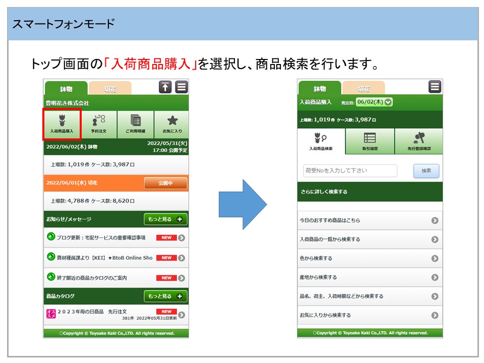 イロドリ*ミドリトップ画面の「入荷商品購入」を選択してください。
